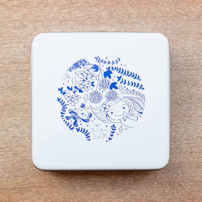 マグカップやボトルデザインをコラボレーションしてくださっている、ウマカケバ クミコさんデザインのスクエア缶です。