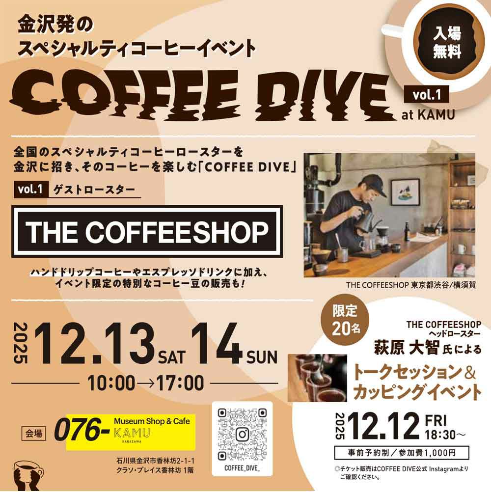 他の画像を見る 【2025/12/12(金)18:30~】COFFEE DIVE@金沢KAMU カッピング&トークセッション ¥ 1,000 税込 販売期間 〜 2025/12/11 23:59 カートに入れる お気に入りに登録する